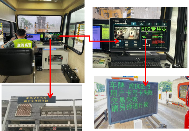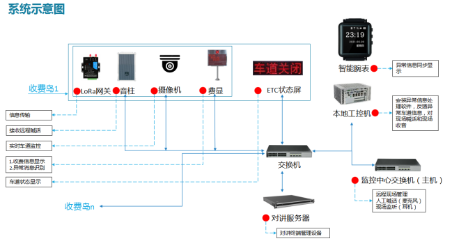 該系統(tǒng)由費(fèi)額顯示系統(tǒng)、語音提示系統(tǒng)、無線通信系統(tǒng)、車道狀態(tài)屏、車道引流屏共同組成。當(dāng)收費(fèi)車道出現(xiàn)異常,管理人員通過“智能腕表”同步接受異常提示,費(fèi)額顯示器、車道狀態(tài)屏顯示異常信息,同步到收費(fèi)站前的車道引流屏提醒車輛收費(fèi)車道通行情況,防止車輛持續(xù)涌入導(dǎo)致?lián)矶隆?/p>