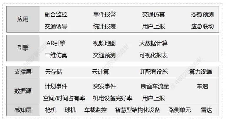 基于上述算法,提出了高速公路區(qū)間交通態(tài)勢預(yù)測系統(tǒng)架構(gòu),分為感知層、數(shù)據(jù)源層、支撐層、引擎層和應(yīng)用層。每個層次根據(jù)不同的功能又分為不同的應(yīng)用模塊。系統(tǒng)架構(gòu)如下圖所示。各層分別執(zhí)行以下功能。