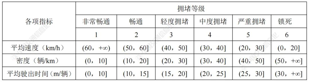 美國交通研究委員會發(fā)行的《道路通信能力手冊》[15]中將交通擁堵狀態(tài)分為六個等級:1非常暢通、2暢通、3輕度擁堵、4中度擁堵、5嚴(yán)重?fù)矶隆?鎖死,數(shù)值越高表明交通擁堵情況越嚴(yán)重。結(jié)合本文具有的道路數(shù)據(jù)資源,確定3個因素指標(biāo)對應(yīng)交通擁堵狀態(tài)的取值范圍,如表2所示。