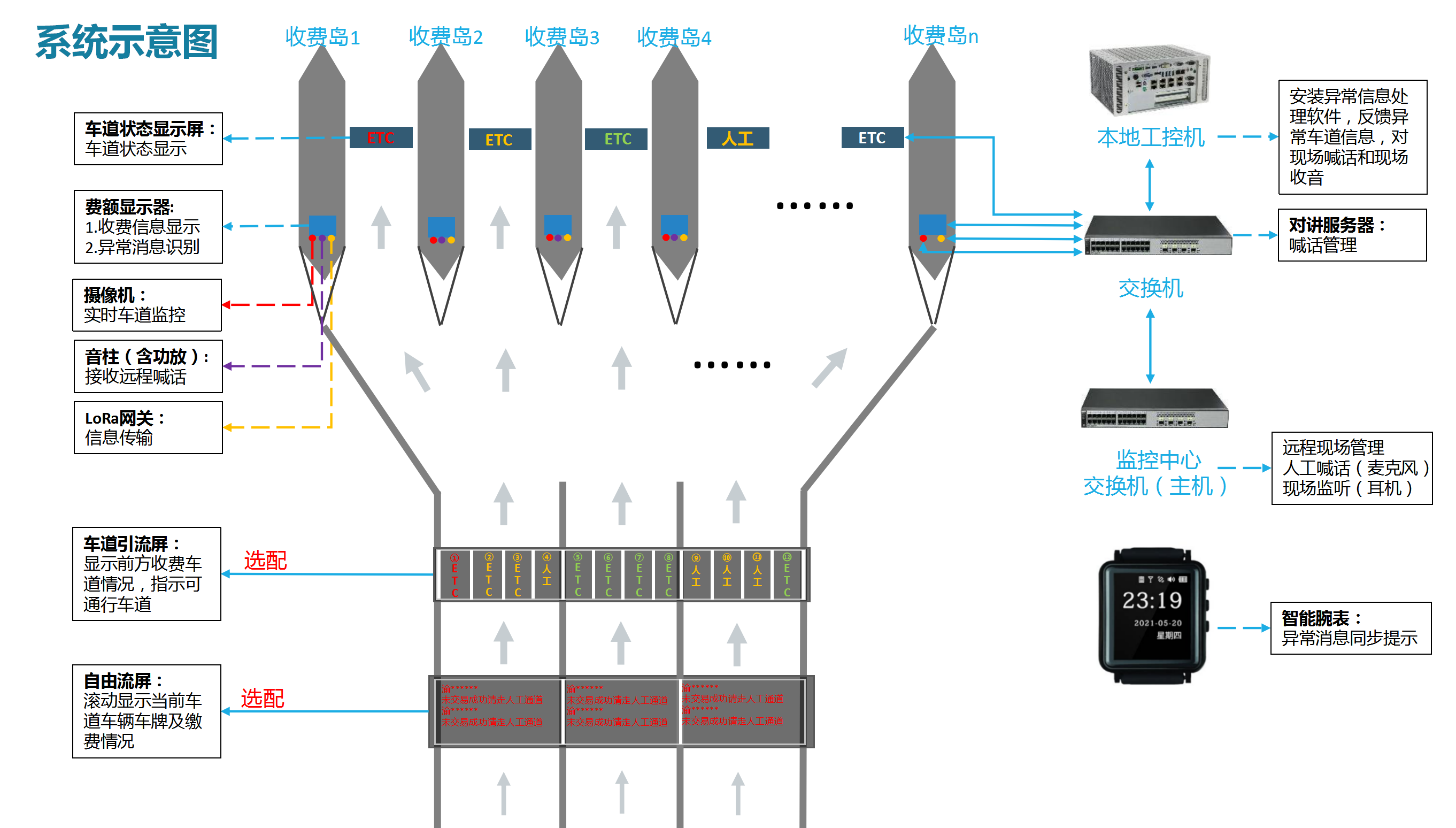 該系統(tǒng)由費額顯示系統(tǒng)、語音提示系統(tǒng)、無線通信系統(tǒng)、車道狀態(tài)屏、車道引流屏共同組成。系統(tǒng)還配置了專門的軟件管理平臺,可對每一條收費車道進行實時監(jiān)控,管理人員無需到場即可通過“遠程喊話”的形式處理特情。系統(tǒng)還可集成自由流屏和車道引流屏,一同助力打造暢行的高速公路收費站。